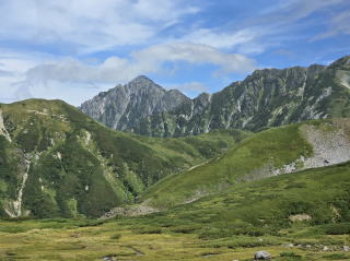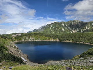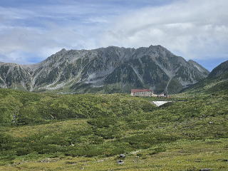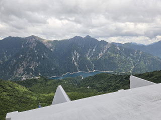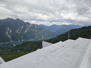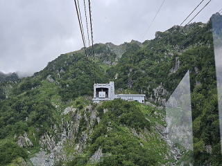 前回はトロリーバスであったが、今は電気バスである。トンネルを10分程抜けると大観峰駅に着いた。屋上の展望台に上がる。ここも凄い景色である。3回目の訪問である。しかし、今回は雲がかかり鹿島槍ケ岳、対面の後立山連峰は一部しか見えない。左は爺ケ岳からしか見えない。岩小屋沢岳、鳴沢岳、赤沢岳、スバリ岳、針ノ木岳、針ノ木岳の左後の蓮華岳は見えない。下に見えるのは黒部ダム湖である。後ろを見ると雄山辺りか一つだけPeakがそそり立っていた。次は黒部平だ。