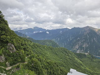 ロープウェイに7分程乗る。ロープウェイの中から大観峰に向けてシャッターを押す。降りてから展望台に上がる。南に見えるのは赤牛岳である。対面の赤沢岳、スバリ岳、針ノ木岳がすぐ前に見える。