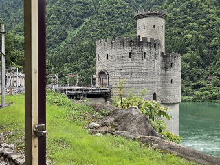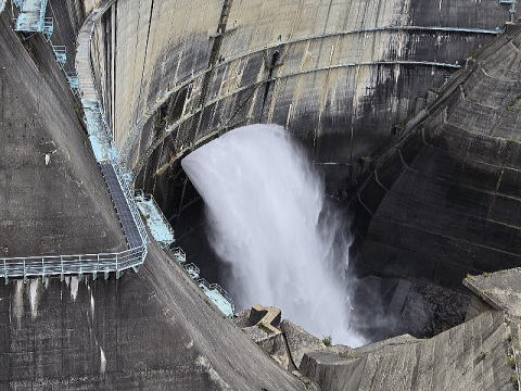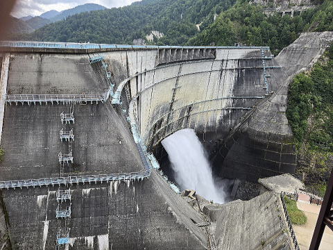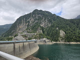 地下ケーブルカーに5分程乗り黒部湖に着く。ここからダムの上を歩くのだ。ダムの上から南の赤牛岳方面、北の方面にカメラを向ける。丁度この 時ダムの放水中であった。カメラに納めたく前回は苦労したが今回は撮影カ所がちゃんと出来ていた。カメラに納める。後は扇沢に向かうだけであ る。