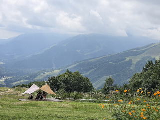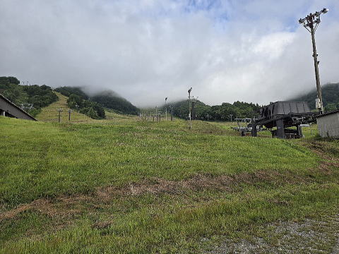 ホテルから南に10分足らず走った所に白馬岩岳ゴンドラ「ノア」の乗場がある。ゴンドラは10分程で山頂駅に着く。スマホを見ると三角点があった 。早速三角点に向かう。二等三角点、標高1289.7mの白茸山(点名:?)である。茸の字は難しい「茜の字の下に早がある」。次に訪れたのはここの一 番名所の所「マウンテンハーバー」である。天気よければ白馬三山(白馬岳、杓子岳、白馬鑓ヶ岳)が見られる展望台のようである。