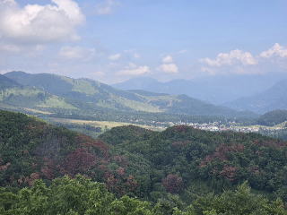 ホテル出発が9:30と遅く時間があったので周辺を散策する。周りは総てスキー場で白馬乗鞍温泉スキー場の看板があった。放牧には羊2匹とメーと 鳴く牛が1匹いた。ホテルの南側には山があった。