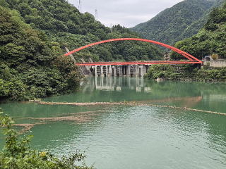 赤い新山彦橋を渡ると直ぐうなづきダム湖がある。綺麗な風景である。最初の駅は柳橋である。駅を過ぎると直ぐに新柳川原発電所がある。暫く行くと車内放送があり、宇奈月温泉への源泉配管の説明があり、暫くして右下に小さな赤い「仏石」があることの説明があった。森石駅を過ぎると黒薙である。笹平駅を通過すると出平駅である。猫又駅近くにネズミ返しの岩壁が黒部川の左岸にある。この岩壁は急傾斜でネズミは登れない。猫も又登れない。この事柄から「猫又駅」の名前を付けたらしい。