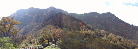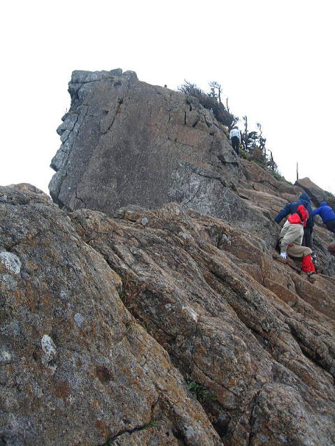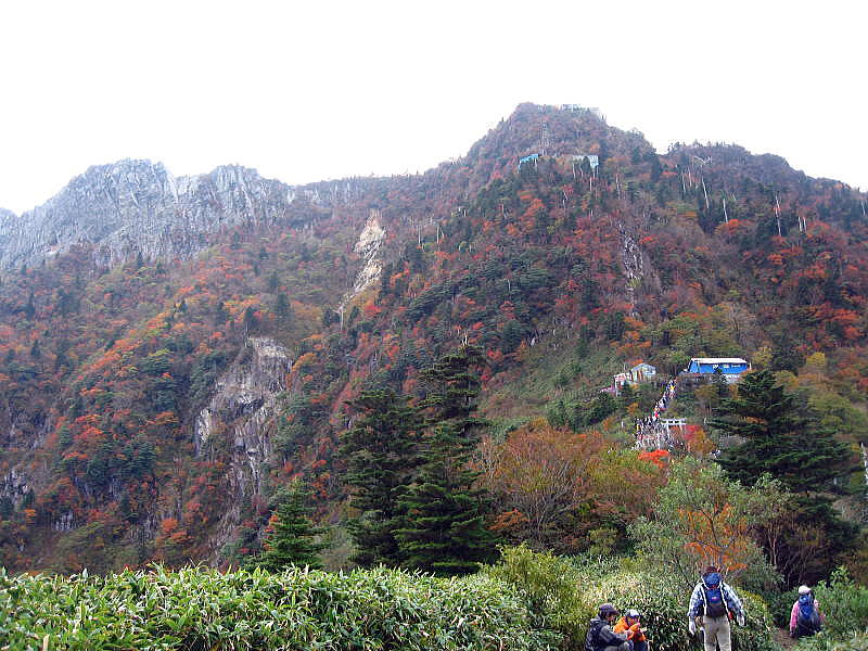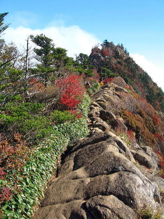 3)石鎚山 今治市朝倉より 左から矢筈岩1846m、南先鋒1982m、天狗岳1982m、弥山1974m、三角点1920.6m 天狗岳に向う(2007.10.20 13:31) 二ノ鎖手前を登る (2007.10.20 12:16)