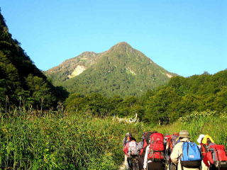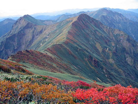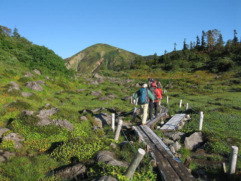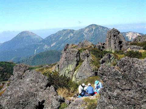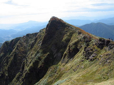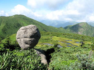 上信越地方には百名山が12座あるが、とくに山容写真として記憶に残る山は越後駒ケ岳、平ケ岳、巻機山、谷川岳、雨飾山、妙高・火打がある。2007.8.25越後駒ケ岳は早朝4:22枝折峠を出発し、途中日の出を迎え尾根道を延々と歩き5時間30分後に登頂した。下山は非常に暑く、日を遮る木々のない尾根道を、水を飲みながら尾根道を下った記憶がある。2007.8.24平ケ岳は民宿伝の助小屋に泊まり、中ノ岐林道登山口から登り、姫ノ池を経由して往復した。2008.10.8巻機山は桜坂登山口より往復した。2007.10.6谷川岳は双耳峰でトマノ耳とオキノ耳を持つ。丁度山頂ではナナカマドの紅葉時期であった。山頂から日本海と太平洋の分水嶺であるオジカ沢ノ頭尾根が良く見え、尾根の東側は青いが、北側は既に赤く紅葉していた風景を眼にした。2008.10.19雨飾山は小谷(オタリ)温泉側から登り、雨飾温泉側に下山した。天気とブナの紅葉に恵まれ、また、ブナの木に囲まれた露天風呂も味わうことも出来た。2007.9.23-24妙高・火打は、山そのものは大したことはなかったが、両日とも快晴に恵まれ、北アルプスから東の山々まで山頂からの展望が良く、日本の山々の縮図を見たようであった。具体的な山容写真は下記のものがある。 ![]() 今から登る越後駒ケ岳(2007.8.25 5:21) 小倉山手前を登る(6:29) 2)平ケ岳 ![]() 姫ノ原から見た平ケ岳(2007.8.24 10:46) 姫ノ原の池塘 (10:48) ![]() 玉子石(8:48) 平ケ岳から見た中の岳と越後駒ケ岳 3)巻機山