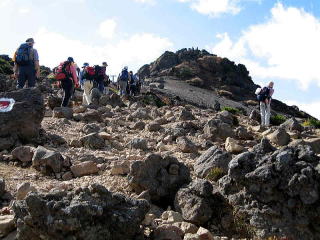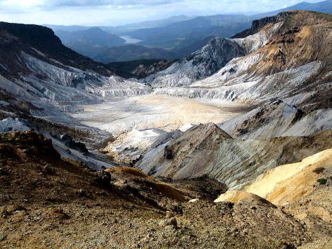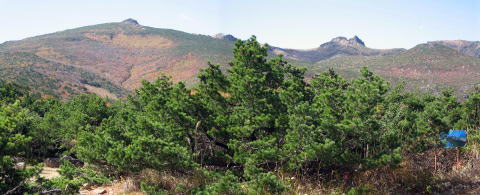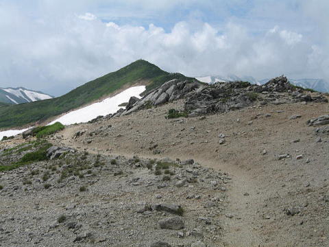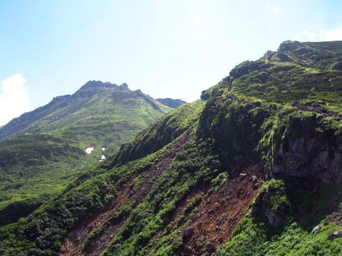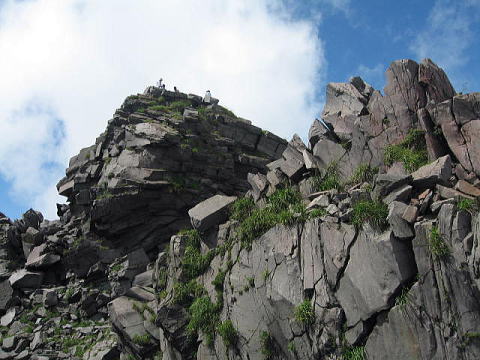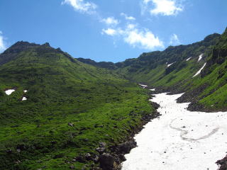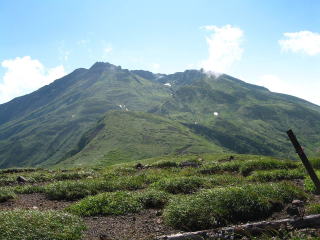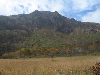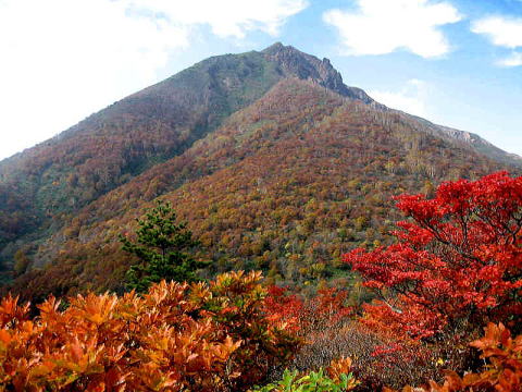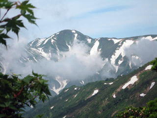 東北地方には百名山が14座あるが、山容写真として記憶に残る山は鳥海山、飯豊山、安達太良山、磐梯山がある。2008.8.5-6鳥海山は前日月山の翌日、単独の登山であった。登りは千蛇谷雪渓から入り、山小屋に泊まり翌日外輪山を経由して下山した。岩稜の新山には三点支持で慎重に登り、降りしには満開のチョウカイフスマの群生地に出会うことが出来た。夕方の日没、七高山でのご来光にも出会え、期待していた影鳥海をも見ることが出来た。2008.7.13飯豊山は寝袋を背負い岩稜の岩場を登る体力の要る長い山行であった。少し時期が早かったがイイデリンドウに出会えることが出来た。2006.10.13安達太良山は奥岳からゴンドラに乗り、山頂駅から歩き、登頂後くろがね小屋経由奥岳に下りた。2006.10.15磐梯山は猫魔八方台登山口から登り、下山は赤埴山経由表登山口に降りた。丁度ブナの紅葉時期で柔らかい紅葉に満喫することができた。具体的な山容写真としては下記のものがある。 御田ケ原より(2008.8.5 8:55) 七五三掛手前より望む(2008.8.5 9:32) 千蛇谷雪渓(10:00) 新山山頂に向う(2008.8.5 12:55) 2) 飯豊山 3)安達太良山 4)磐梯山 |